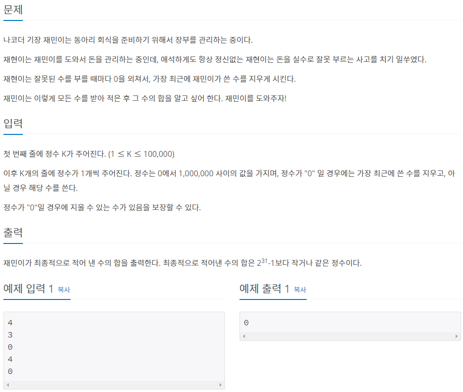: 0이 아니면, push()#include <iostream> #include <stack> using namespace std; int main() { int K; cin >> K; stack<int> pocket; for (int i = 0; i < K; i++) { int a; cin >> a; if (a == 0) pocket.pop(); else pocket.push(a); } int sum = 0; while (1) { if (pocket.empty()) break; sum += pocket.top(); pocket.pop(); } cout << sum; }'알고리즘 풀이 > 백준' 카테고리의 다른 글